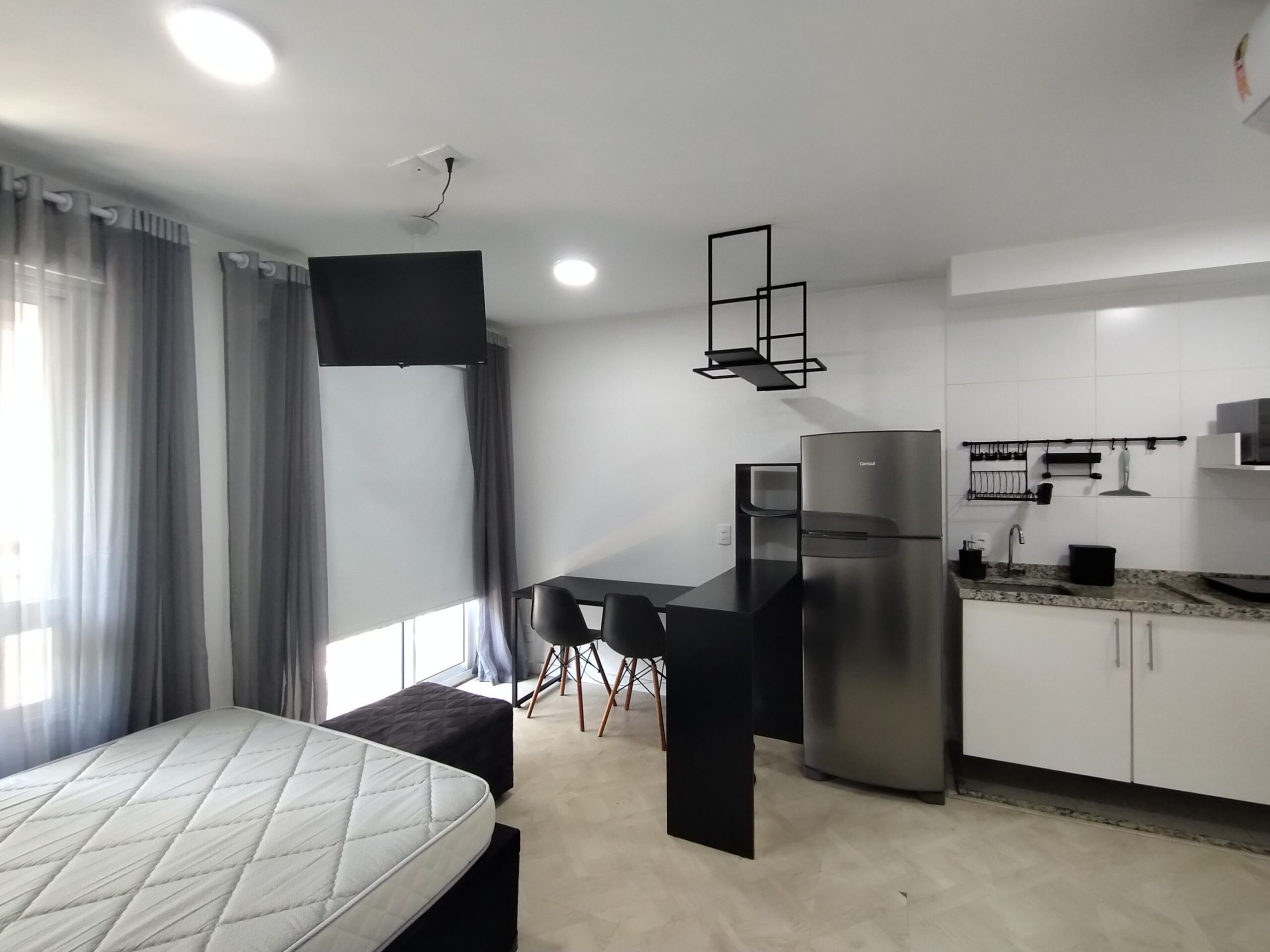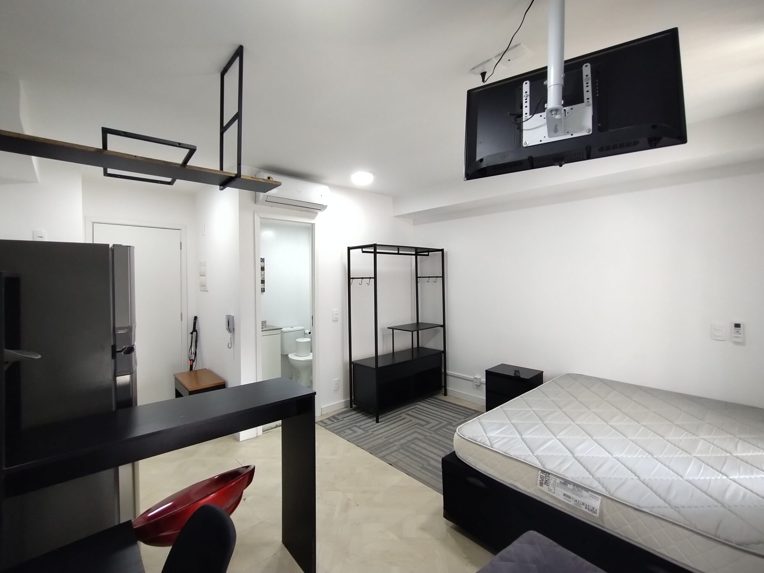 DORMITÓRIO COM AR-CONDICIONADO, SACADA, COZINHA E BANHEIRO.